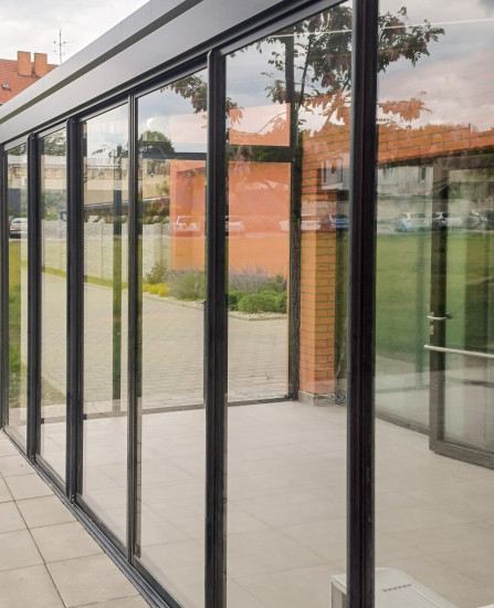 Celohliníkový vestibul s tvrzeným sklem Tato realizace představuje moderní vstupní vestibul z celohliníkové konstrukce doplněné o jednoduché tvrzené sklo. Střecha je zhotovena z mléčného skla, které příjemně rozptyluje světlo. Součástí řešení jsou odsuvné stěny a samostatné vstupní dveře , které zajišťují pohodlný vstup a zároveň chrání dům před nepříznivým počasím. Elegantní, trvanlivé a bezúdržbové řešení, které ladí s architekturou moderních domů i zimních zahrad.