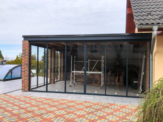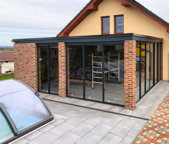 Původní pergola z cihelných sloupků byla doplněna o moderní hliníkový rámový systém s posuvným zasklením. Nové řešení poskytuje ochranu před větrem i deštěm a zároveň zachovává vzdušnost a styl původní stavby. Díky posuvným skleněným stěnám lze prostor snadno otevřít nebo uzavřít podle počasí, což umožňuje pohodlné využití terasy po celý rok.