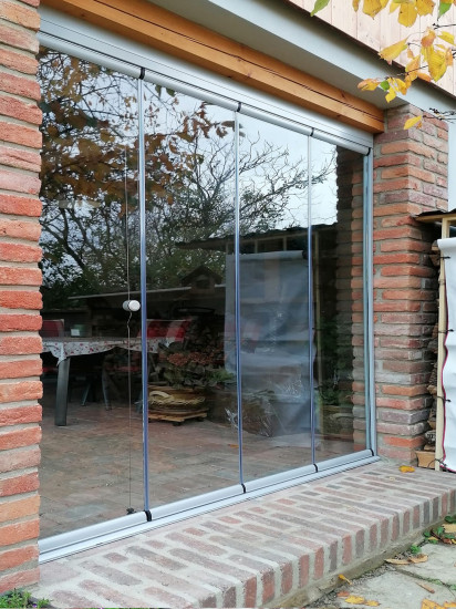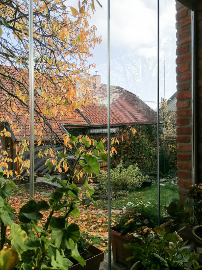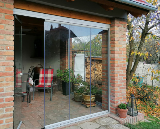 Zahradní domek byl doplněn o moderní bezrámový posuvný systém, který umožňuje pohodlné otevření i uzavření prostoru podle počasí. Skleněné stěny zachovávají přirozené světlo a propojují interiér se zahradou, zatímco cihlové zdivo a dřevěné detaily vytvářejí příjemnou, útulnou atmosféru. Výsledkem je funkční a esteticky vyvážené řešení vhodné pro celoroční využití.